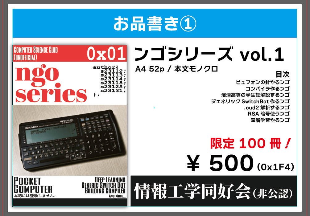 コミケとかでもよくあるお品書きも作った。これは国立国会図書館に納本するときに必要になるかもしれないので作ったほうが良い。